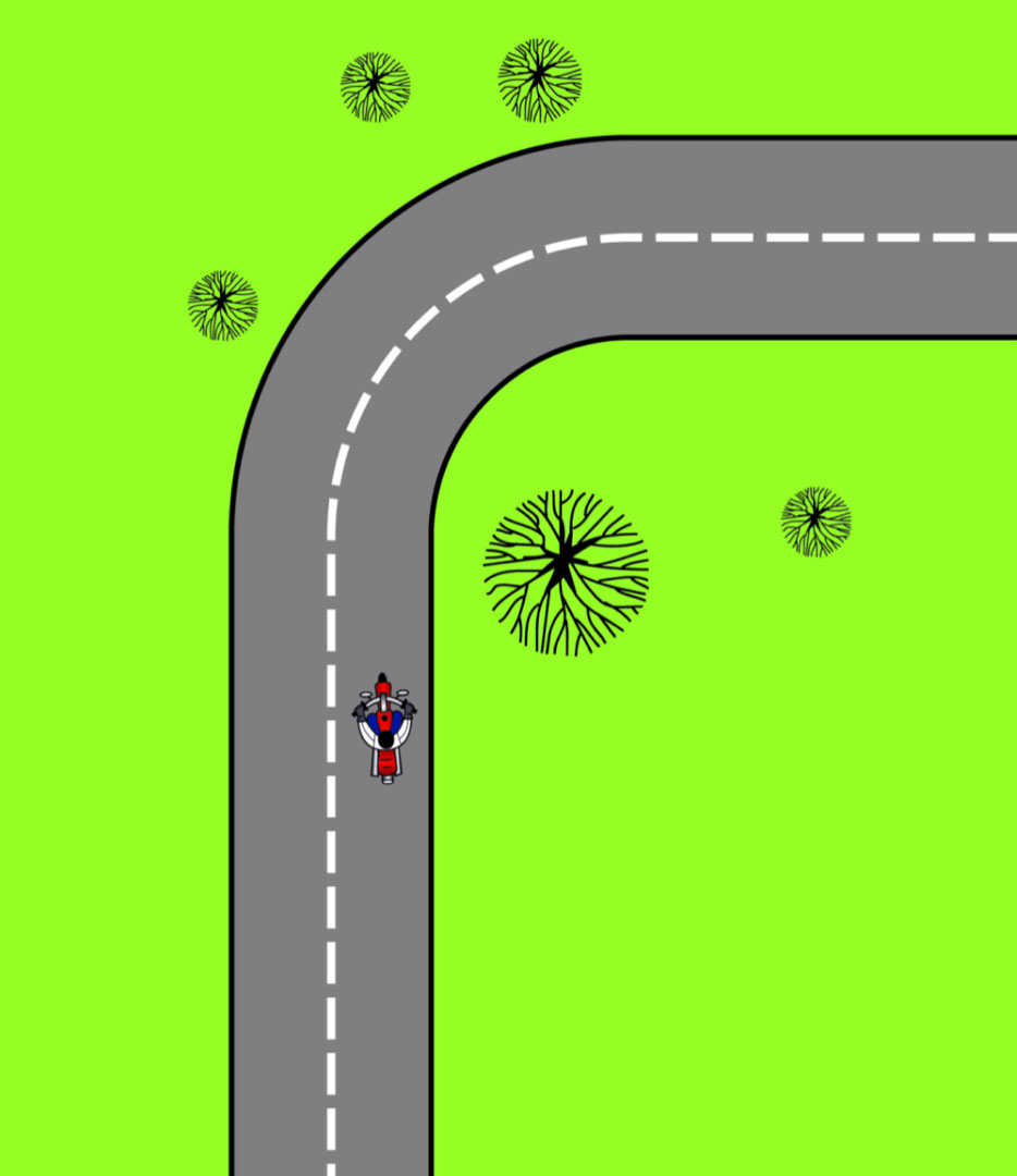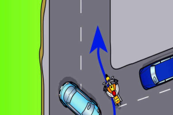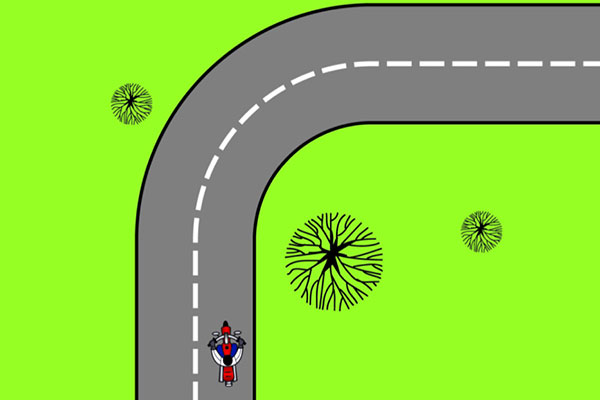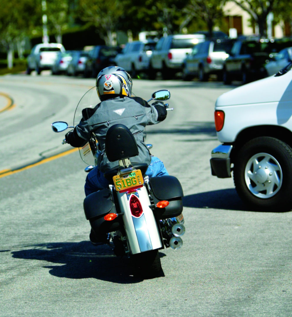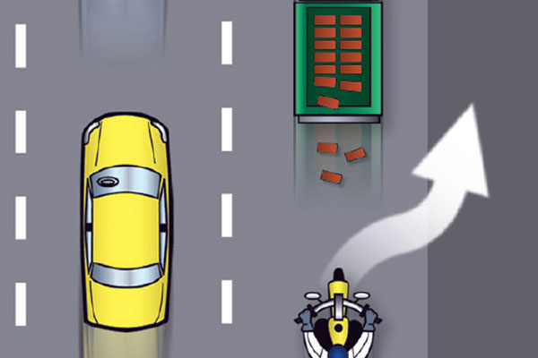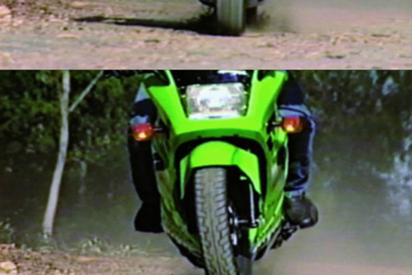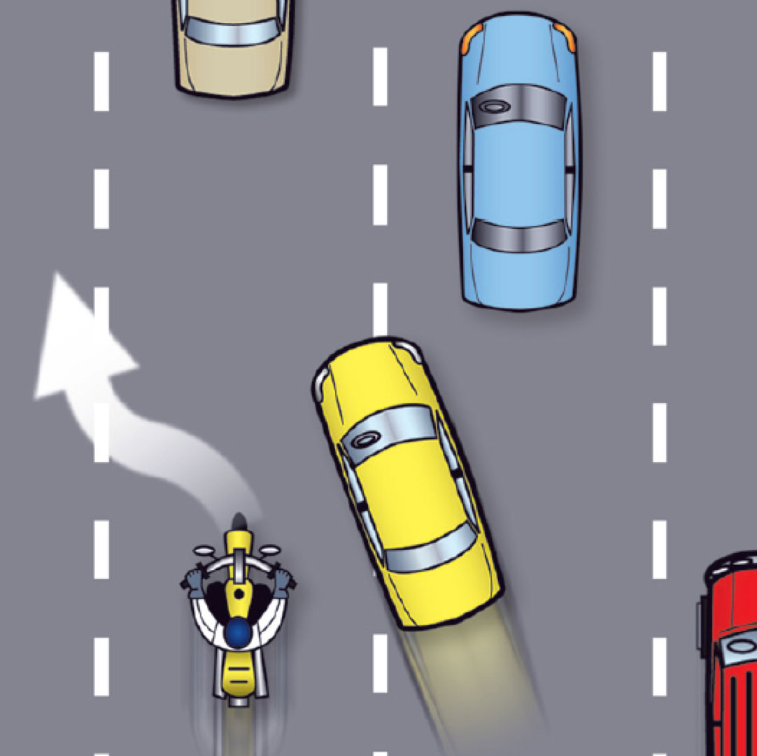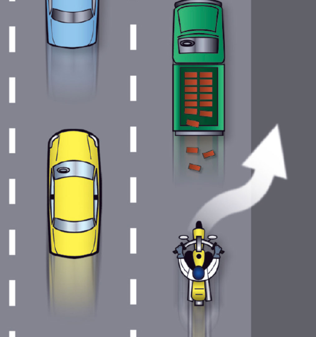 Making an emergency stop in a curve requires effective use of available traction for both leaning and braking. 128Some traction is used for cornering, so you should generally use less brake pressure in a curve than when braking in a straight line. Basically, you have two choices. 129One is to straighten up first and make a quick stop in a straight line.The other is to apply some brake pressure while leaned and increase brake pressure as the motorcycle straightens up.
