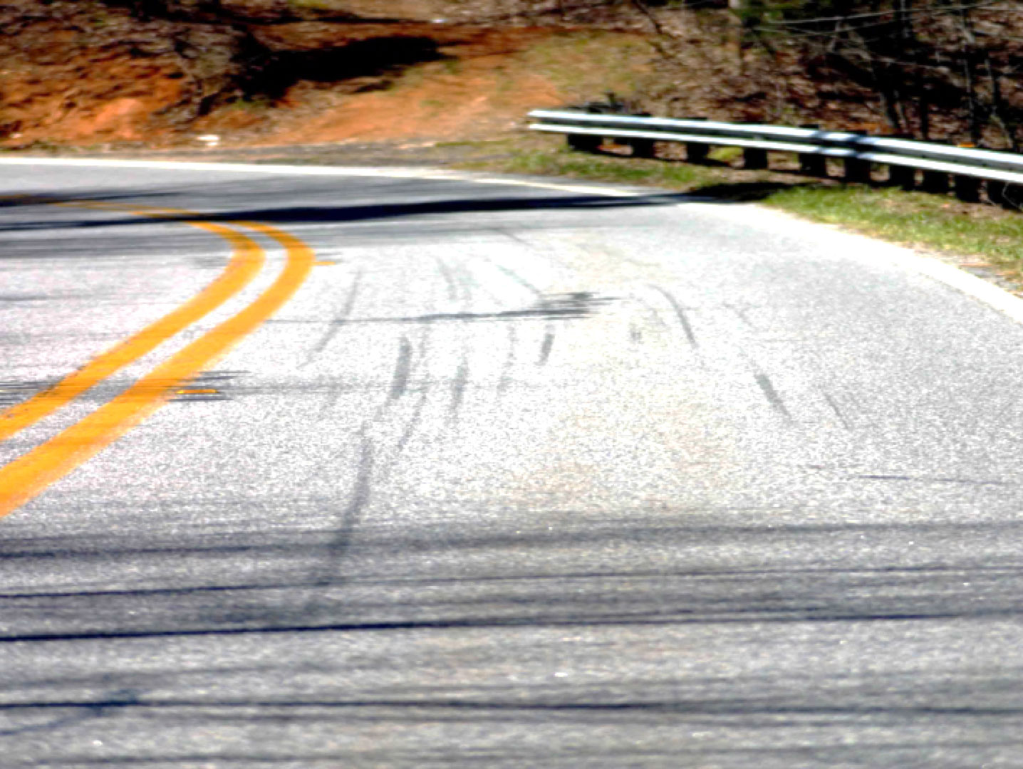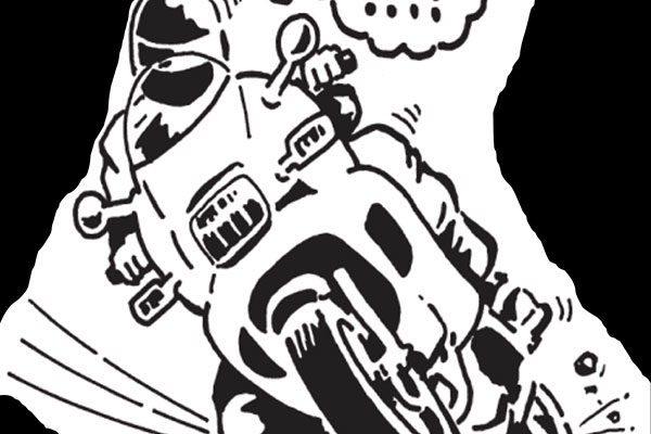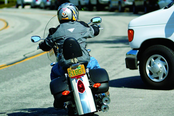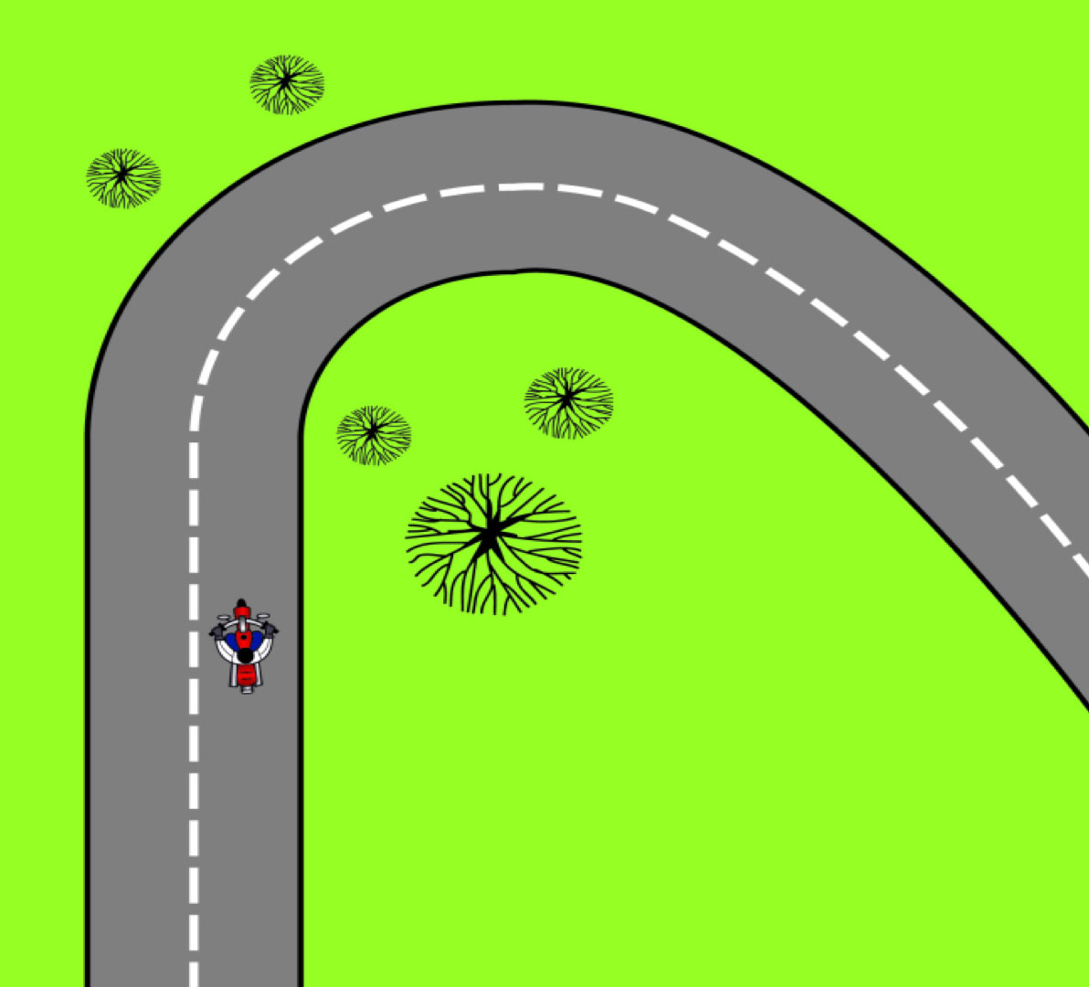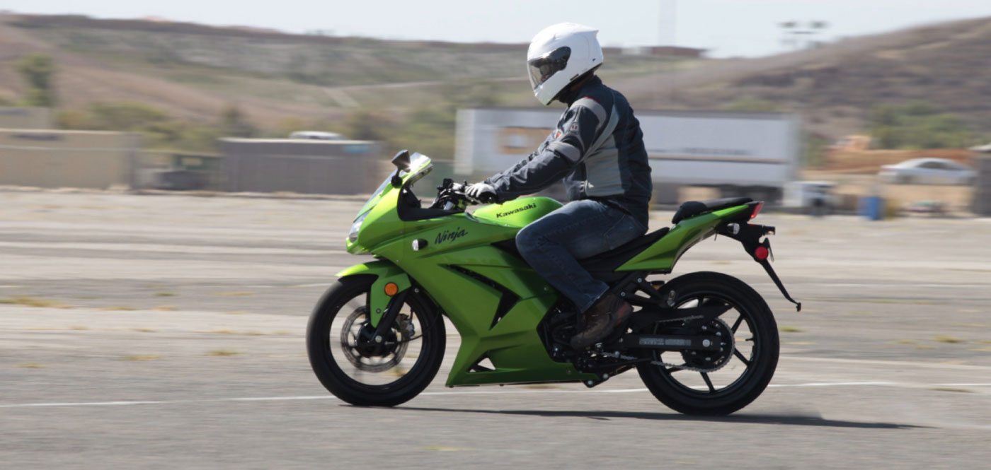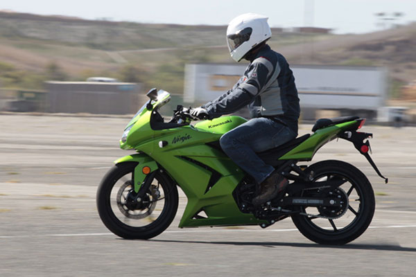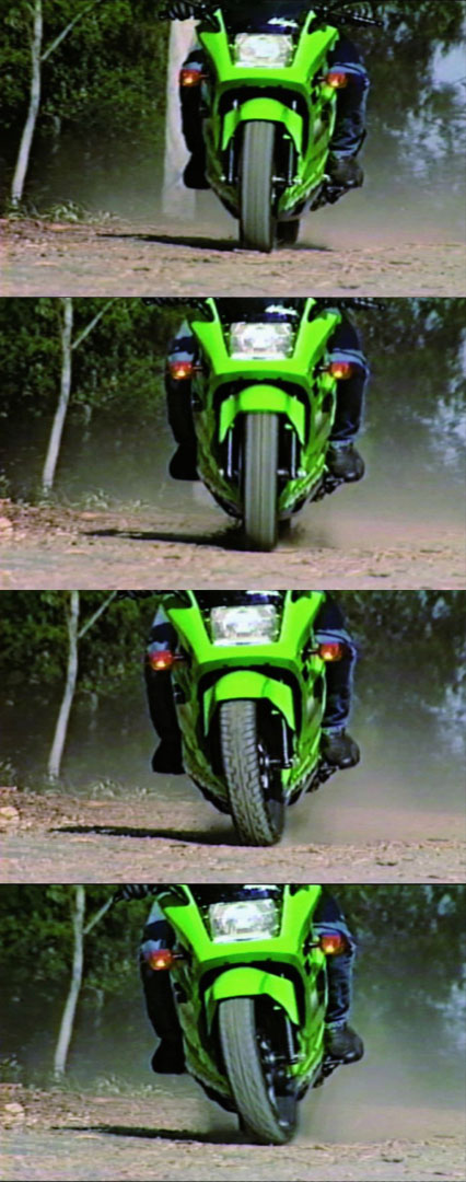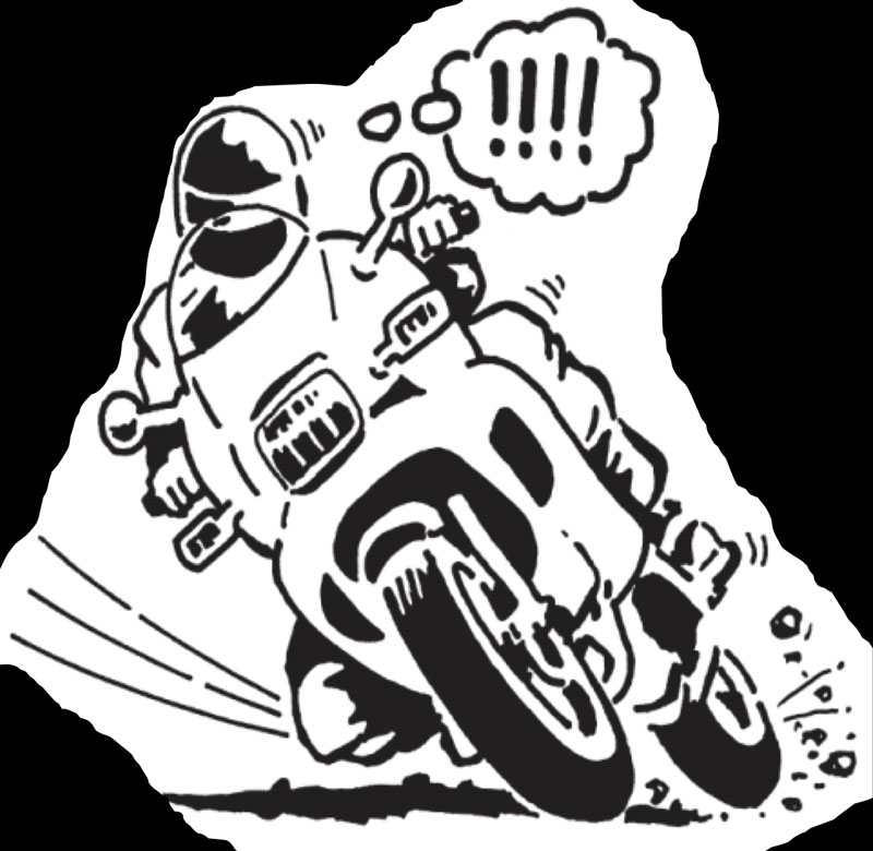 Making an emergency stop in a curve requires effective use of available traction for both leaning and braking. 128Some traction is used for cornering, so you should generally use less brake pressure in a curve than when braking in a straight line. Basically, you have two choices. 129One is to straighten up first and make a quick stop in a straight line.The other is to apply some brake pressure while leaned and increase brake pressure as the motorcycle straightens up.